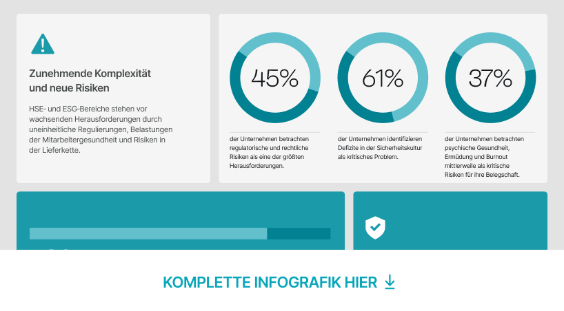 HSE‑ und ESG‑Verantwortliche haben mit vielschichtigen Vorschriften, neuen Herausforderungen in der Mitarbeitergesundheit und Unterbrechungen in der Lieferkette zu kämpfen. Dies sind Faktoren, die das organisatorische Risiko weiter erhöhen. Eine besonders bemerkenswerte Erkenntnis ist dabei, dass 45 % der Unternehmen regulatorische und rechtliche Risiken als eine ihrer größten Hindernisse sehen. Das unterstreicht den dringenden Bedarf an flexiblen, integrierten Managementstrategien.