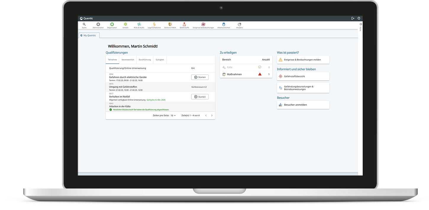 Quentic Core ist Ihr Startpunkt: Bilden Sie Ihre Unternehmensstrukturen ab, teilen Sie die neuesten Versionen wichtiger Dokumente und erreichen Sie Commitment zu Aufgaben und Maßnahmen. Alle anderen Quentic HSE-Module Ihrer Wahl setzen direkt auf dieser Datengrundlage auf, sodass unternehmensweit konsistente Geschäftsprozesse sichergestellt sind. Über die differenzierte Verwaltung von Benutzern und Zugriffsrechten binden Sie Mitarbeitende genauso wie Externe aufgabenbezogen in das gemeinsame System ein.